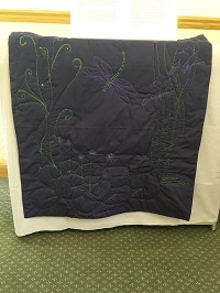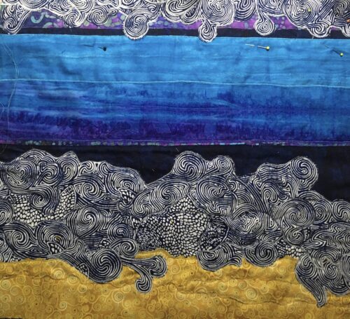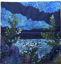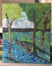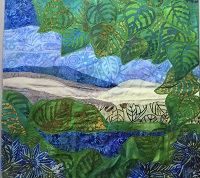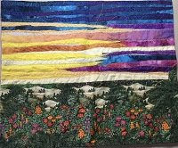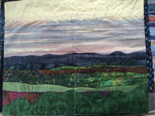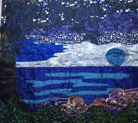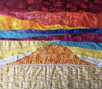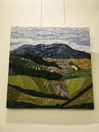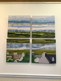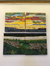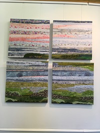 Now we come to the Pictures, made with the same techniques as the cushions but stretched on to wooden frames and designed for hanging to exhibit. With a solo exhibition in mind there were three large pieces each of which was made up of four individual pictures described as quartets. Each quarter measured 45cm x 45cm and gave a view of the Estuary as through a window. Sunrise, Day time and Sunset.