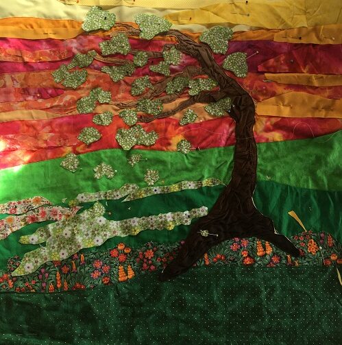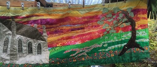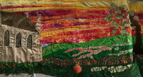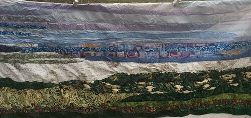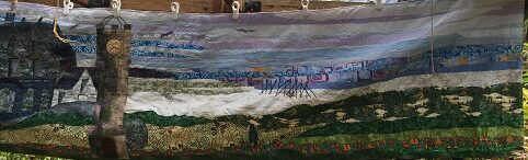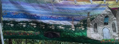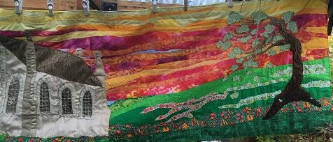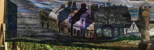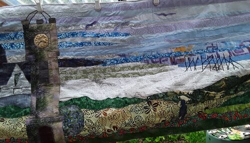It wasn't just me in all this. The Ladies Kirkmabreck Quilters were all up for the challenge. Fabrics were released from stash boxes, Ideas were cast about at weekly get togethers. The design was approved by the Art Centre Committee. Things that were needed ordered and the piles of materials, fabrics, notions stacked up and ready for things to get going. Then..... life got in the way and slowed everything down. There was no deadline - which I'm rather glad of because it would have been missed. Everything was ready by the Winter of 2021, work actually started the summer of 2022 and the whole thing finished by mid summer 2023. In the end but with a lot of support it was a one woman (me) event. Admittedly for and on behalf of the Ladies of Kirkmabreck Quilters past and present.