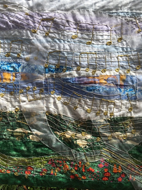 Having a wildly optimistic day, I said yes to designing a wall hanging for a Village Arts Centre. The brief was to incorporate the Centre's Logo, two musical clef and base and treble and line it with wadding to act as a sound baffle-if that's the right word. I have no idea if the sound baffling is successful. The hanging position was to be on the back wall above the top row of seats and under the back lights. Somewhat tricky being between heads and lights. Long and narrow it seemed was the only option. In the event it became two long (10ft by 2ft, in old money) and a third after thought of a central piece (2ft.6in by 2ft) I will let those among us do the conversion into metric.